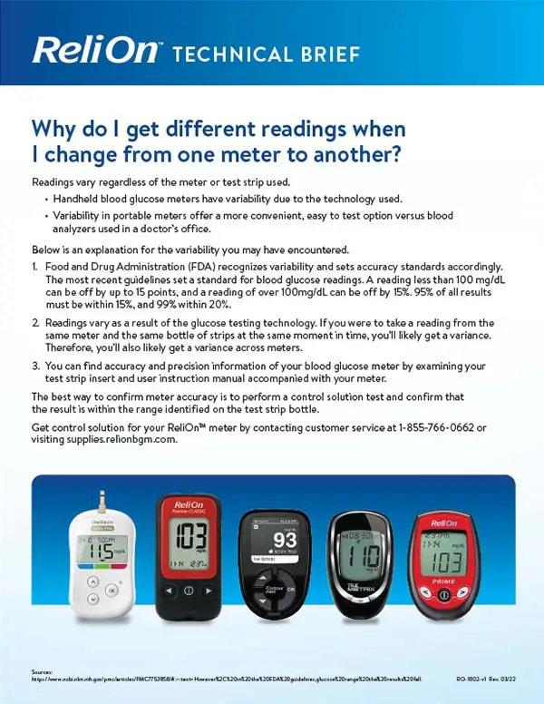 The ReliOn™ brand offers a full range of quality, cost-effective meters to meet your testing needs. Your Walmart pharmacy staff is well versed in this area and can help answer any questions you might have.